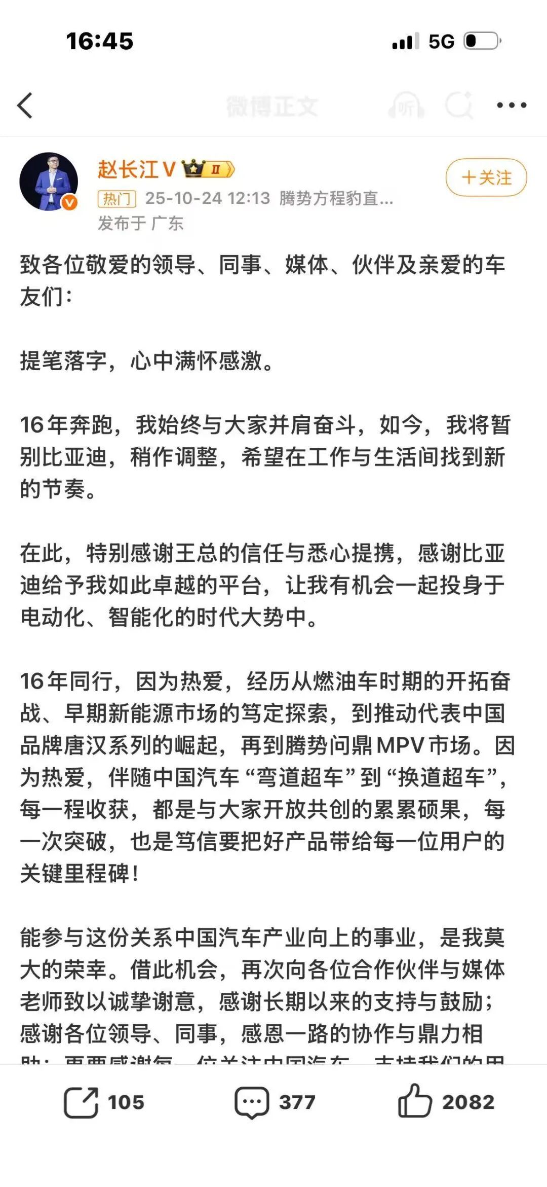 10月24日,赵长江在社交媒体发文,宣布将离开比亚迪。
