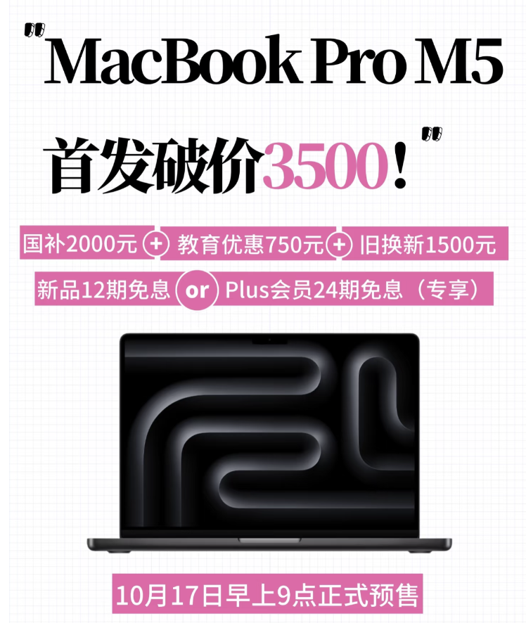Macbook pro M5首发破价,经过各项补贴后,实际最高可降3500元。