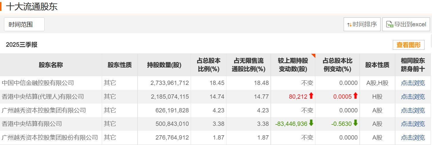 有观点认为,压单的是越秀资本。2024年11月12日,越秀资本公告称,董事会拟同意公司及子公司,自董事会审议通过之日起至2025年12月31日期间在二级市场出售不超过中信证券总股本1.00%的股份(即约1.48亿股,套现总金额按当时市值约为46亿元)。2024年11月,越秀资本出售中信证券0.28亿股,占比0.19%,减持金额约为8亿元。