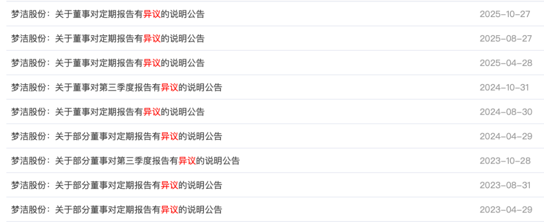 据悉,陈洁于2023年2月3日起任梦洁股份董事。据证券时报,从2023年至今,陈洁已连续9次对公司财报表达异议,其中多次提到梦洁股份在大方睡眠及叶艺峰上的财务问题。