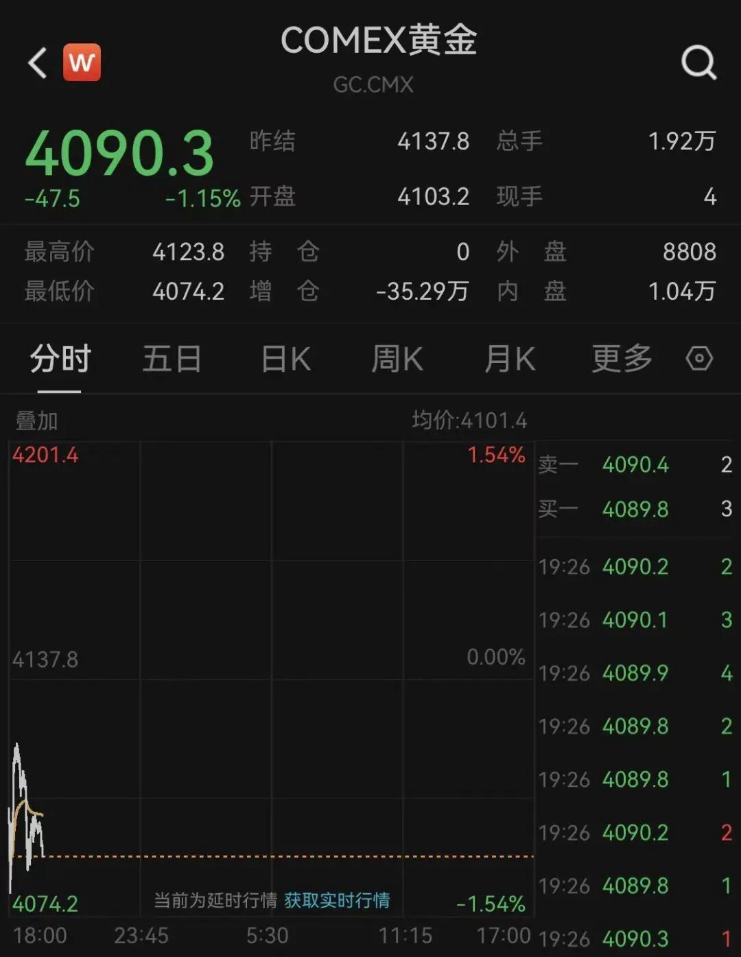 截至发稿,伦敦金跌逾1%,跌破4100美元,COMEX黄金也跌超1%。