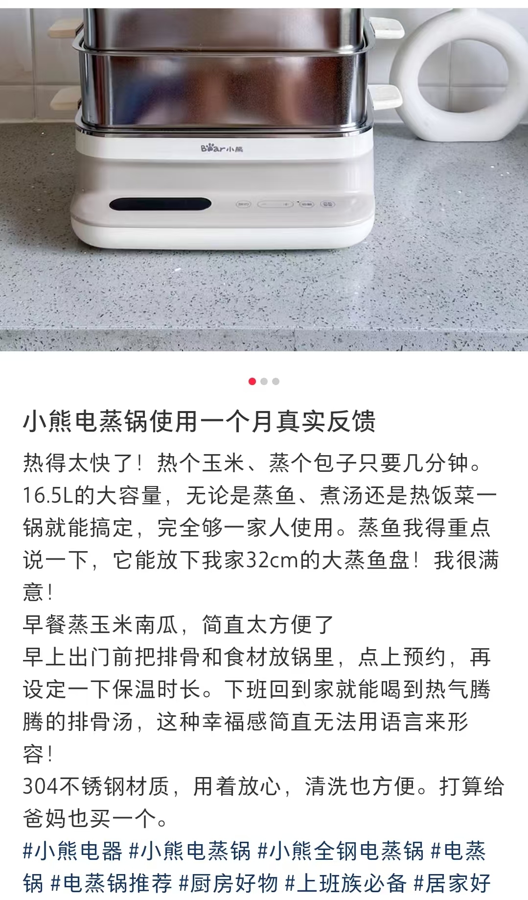 也有人分享小熊电蒸锅的便捷,称“热玉米、蒸包子几分钟就能搞定,用着安心,清洗也省事”。