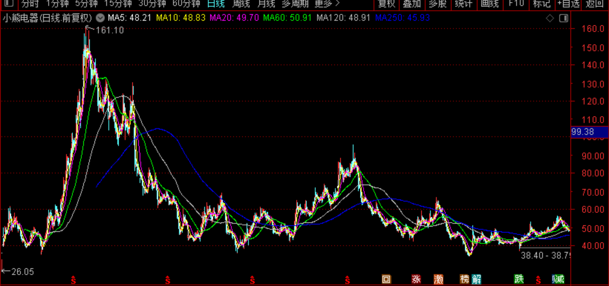此外,小熊电器的股价也持续承压,自2020年触及165元/股的高点后,便步入长达五年的下行通道。
