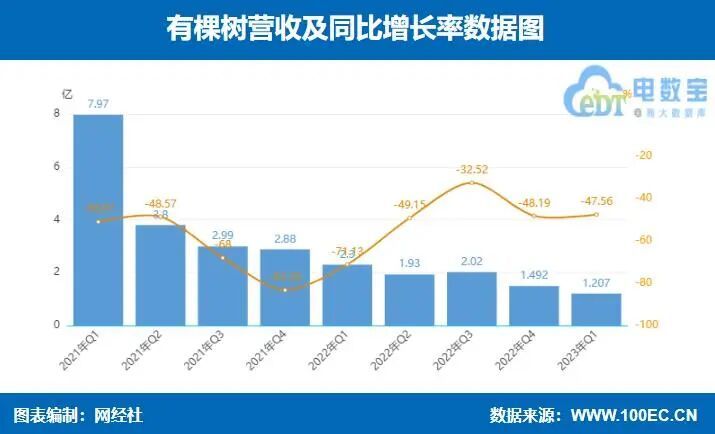2021年,有棵树在亚马逊上的收入就从2020年的15亿元左右下降到了5亿元,跌幅达到65.86%。受此影响,2021年,有棵树营收仅有17.64亿元,同比下降64.91%;归母净利润亏损高达26.76亿元,同比下降207.3%。