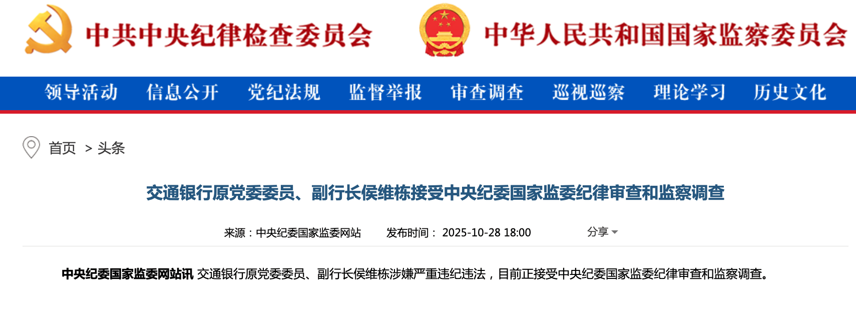 凤凰网财经讯 10月28日,据中央纪委国家监委网站消息,交通银行原党委委员、副行长侯维栋涉嫌严重违纪违法,目前正接受中央纪委国家监委纪律审查和监察调查。