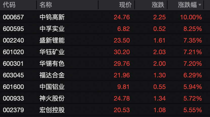 有色金属板块大涨,板块涨幅超过2.5%。中钨高新涨停,中孚实业、盛新锂能、华钰矿业、华锡有色、福达合金等股票盘中涨幅居前。