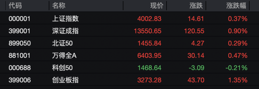A股市场今天(10月29日)上午整体走强,上证指数重上4000点整数关口。创业板指数表现强劲,盘中涨幅一度超过2%,后涨幅收窄。截至午间收盘,上证指数涨0.37%,深证成指涨0.9%,创业板指涨1.35%,北证50指数涨0.29%,科创50指数跌0.21%。