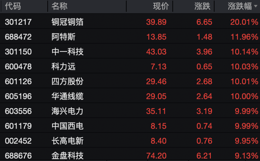 行业板块和赛道方面,若按照申万一级行业划分,电力设备板块领涨,板块盘中涨幅一度接近3%。铜冠铜箔“20cm”涨停,阿特斯涨幅一度超过13%,中一科技涨幅一度超过11%,科力远、四方股份、华通线缆、中国西电、海兴电力等多股涨停。