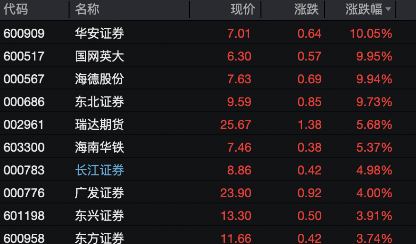 非银金融板块盘中出现拉升,被称为“牛市旗手”的券商股盘中大幅拉升,其中华安证券、东北证券盘中均触及涨停。截至午间收盘,华安证券、国网英大涨停,海德股份、东北证券涨超9%,瑞达期货、东兴证券、广发证券、长江证券等跟涨。