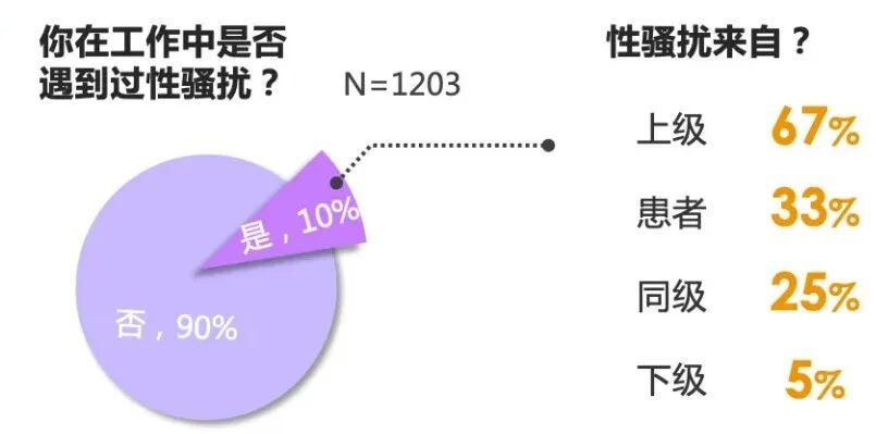 此前丁香园曾发起过一项调查,结果显示,有 10% 的女性医生明确表示曾遭遇职场性骚扰,这些性骚扰有近七成来自上级。