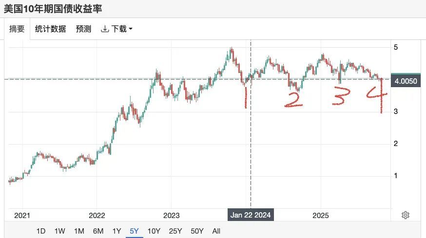 这两年美债的走势总是“雷声大、雨点小”,好几次看起来要涨,结果总是被各种突发事件打乱节奏——比如通胀突然反弹、就业数据超预期等等,导致美债出现了很多“假牛的动作”。