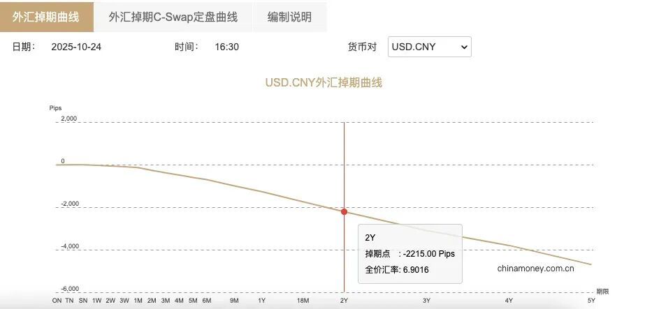 目前外汇掉期市场对汇率的看法是:(随着美联储降息或者其他原因),美元兑人民币会缓慢升值,1年预期在7位置,两年预期在6.9的位置。