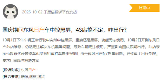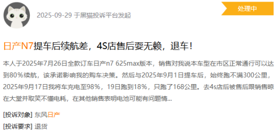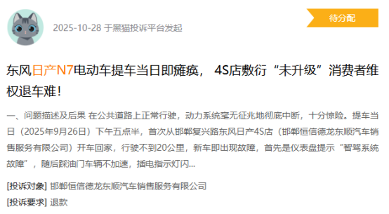 有消费者投诉表示,自己购买的东风日产N7电动车提车当天行驶不到20公里即出现故障,问题包括仪表盘提示“智驾系统故障”,以及踩油门车辆不加速。还有用户称,自己的日产N7提车后续航差,始终跑不满300公里,寻求售后帮助无果。