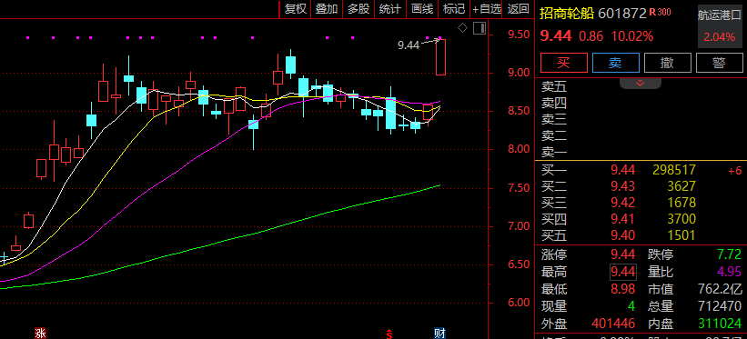 盘初,航运板块走强,油运方向领涨,招商轮船涨停,中远海能、招商南油、中远海特、国航远洋等跟涨。