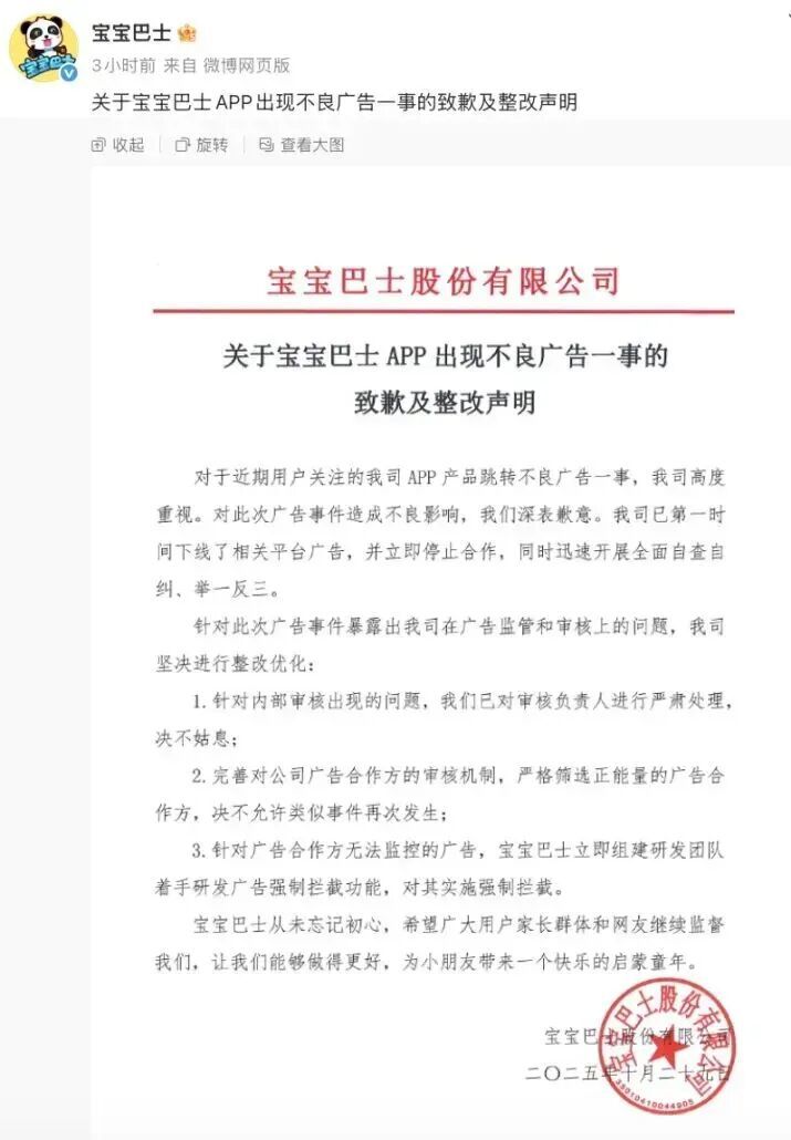 事件冲上热搜后,宝宝巴士在10月29日发布致歉声明。字里行间看似诚意满满:处理审核负责人、完善合作方审核机制、研发广告拦截功能。