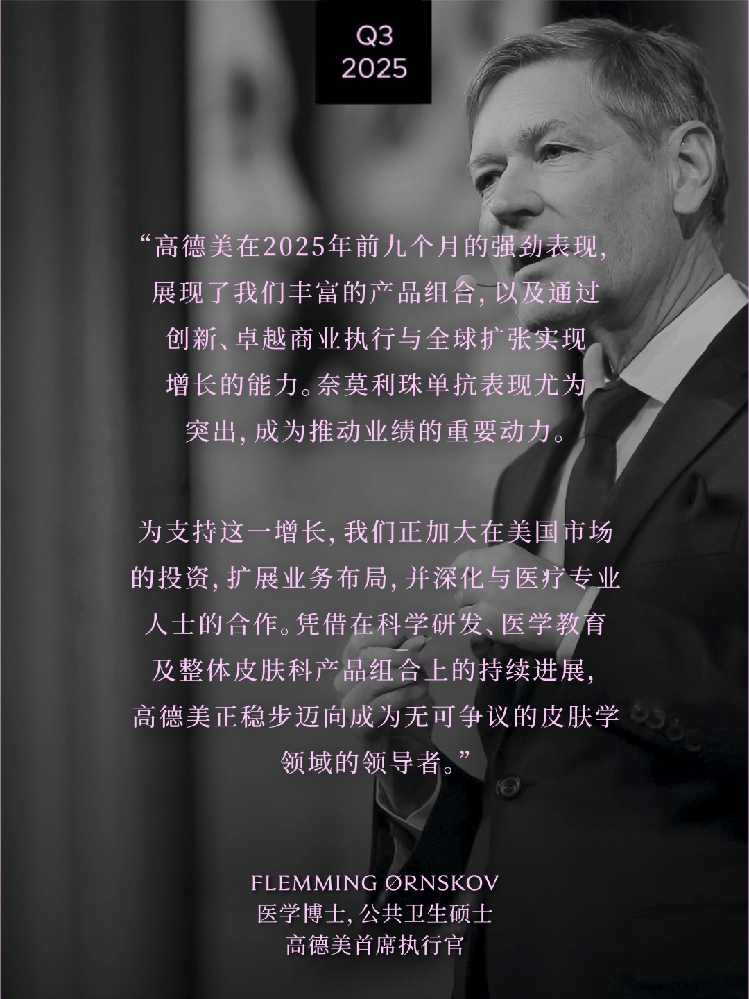 “高德美在2025年前九个月的强劲表现,展现了我们丰富的产品组合,以及通过创新、卓越商业执行与全球扩张实现增长的能力。奈莫利珠单抗表现尤为突出,成为推动业绩的重要动力。为支持这一增长,我们正加大在美国市场的投资,扩展业务布局,并深化与医疗专业人士的合作。凭借在科学研发、医学教育及整体皮肤科产品组合上的持续进展,高德美正稳步迈向成为无可争议的皮肤学领域的领导者。”