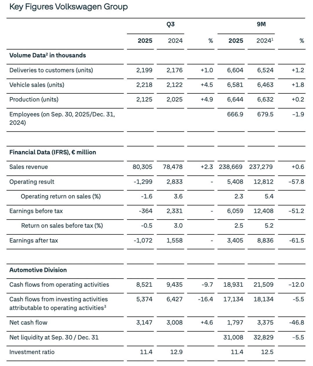 大众集团首席财务官阿诺·安特利茨表示,与上年同期相比,业绩明显走弱主要是受低利润率的电动车产量增加,以及合计75亿欧元的额外负担影响,其中包括美国进口关税、旗下品牌保时捷的产品战略调整和相关商誉及企业价值减记等。若剔除相关费用,集团前三季度利润率为5.4%。
