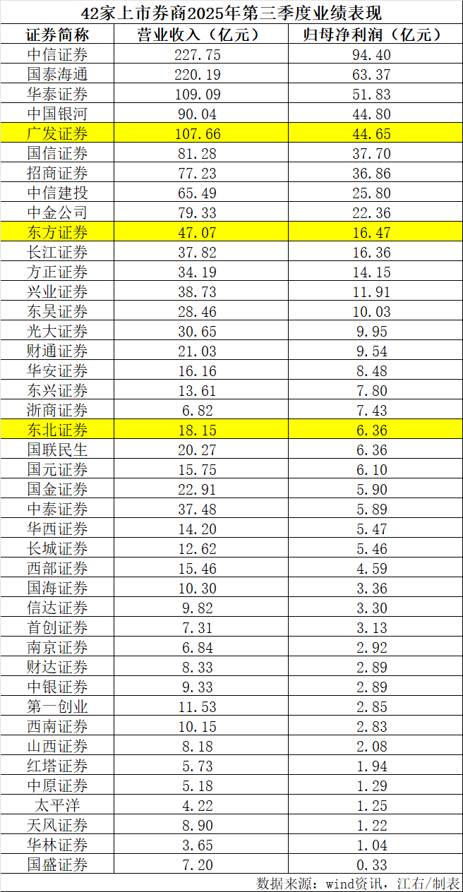 上市公司2025年三季报披露收官,42家纯券商上市公司业绩也随之出炉。由于股票市场持续回升,券商业绩普遍大幅增长,财富管理业务和自营业务是券商业绩增长的主要动力来源。