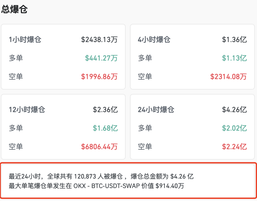 在加密货币价格剧烈波动的背景下,全球爆仓人数大幅飙升。据CoinGlass最新数据,最近24小时内,全球共有120873人爆仓,爆仓总金额达4.26亿美元(约合人民币31亿元)。