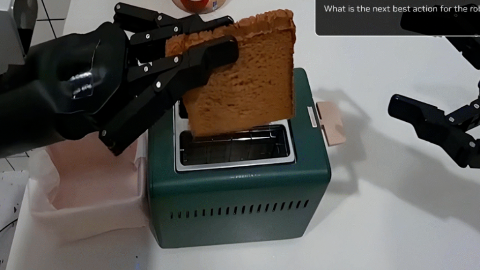 在英伟达给出的案例中,运行视觉推理模型的机器人手臂,成功根据“面包+烤面包机”的场景,推断出最合理的下一步动作是将面包放进烤面包机进行烘烤,并将思考逻辑转化成机器手臂的操作指令。