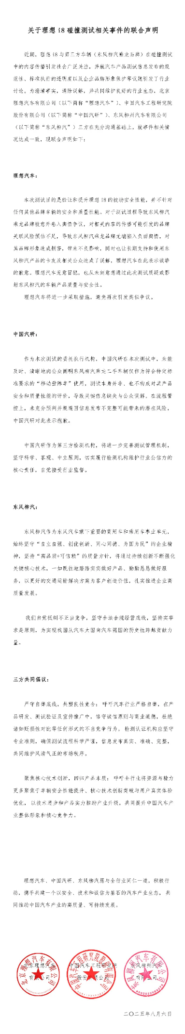 随着舆论发酵愈演愈烈,8月6日晚间,理想汽车、中国汽研、乘龙卡车三方相继发布了《关于理想 i8 碰撞测试相关事件的联合声明》,才终于为此事画上了句号。