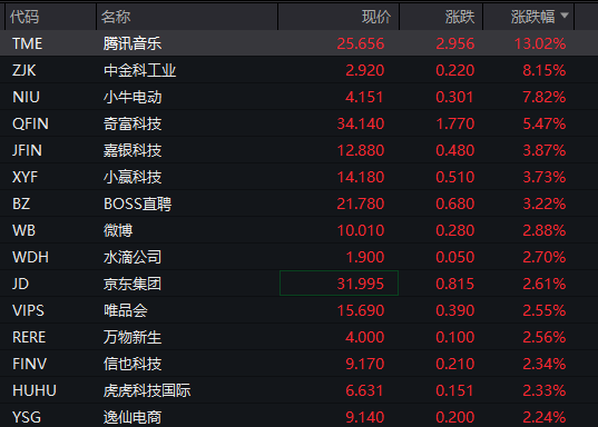 热门中概股中,腾讯音乐涨超13%,中金科工业、小牛电动、奇富科技等涨幅超过5%。