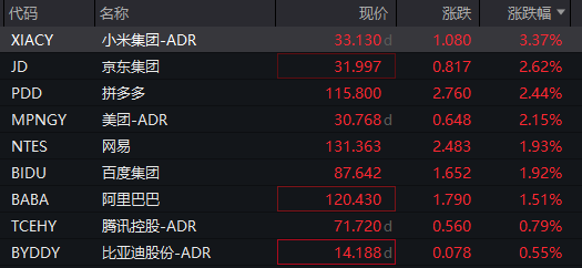 万得中概科技龙头指数涨幅超过1.6%,其中,小米集团ADR涨超3%,京东集团、拼多多、美团ADR涨超2%,网易、百度、阿里巴巴涨超1%。