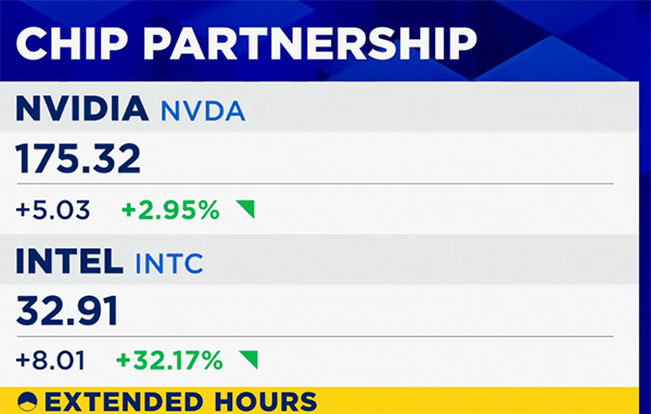 消息公布后,英特尔股价在盘前交易中一度猛涨超30%,英伟达股价也上涨3%左右。