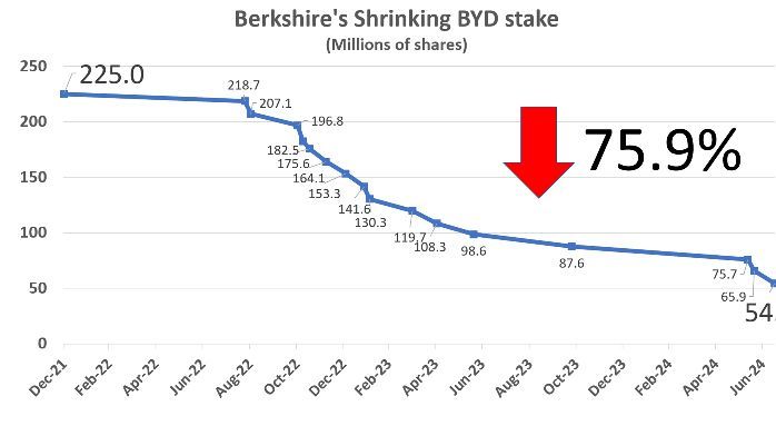 到去年 6 月,伯克希尔已出售了近 76% 的比亚迪股份,使其持股比例降至比亚迪已发行股份的略低于 5%。