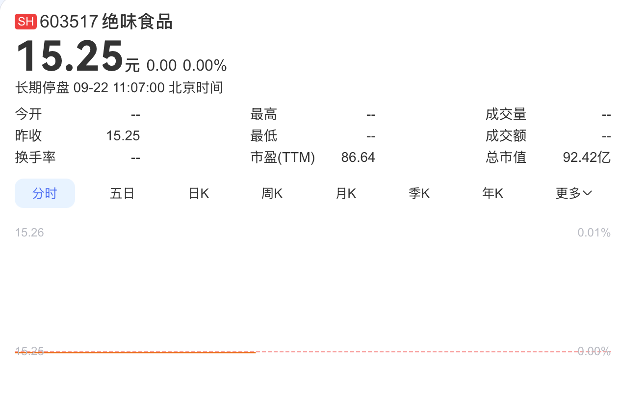 更严重的是,公司股票于9月22日停牌一天,23日起被实施其他风险警示,A股简称变更为“ST绝味”。截至9月19日收盘,绝味食品股价15.25元/股,总市值为92.42亿元。