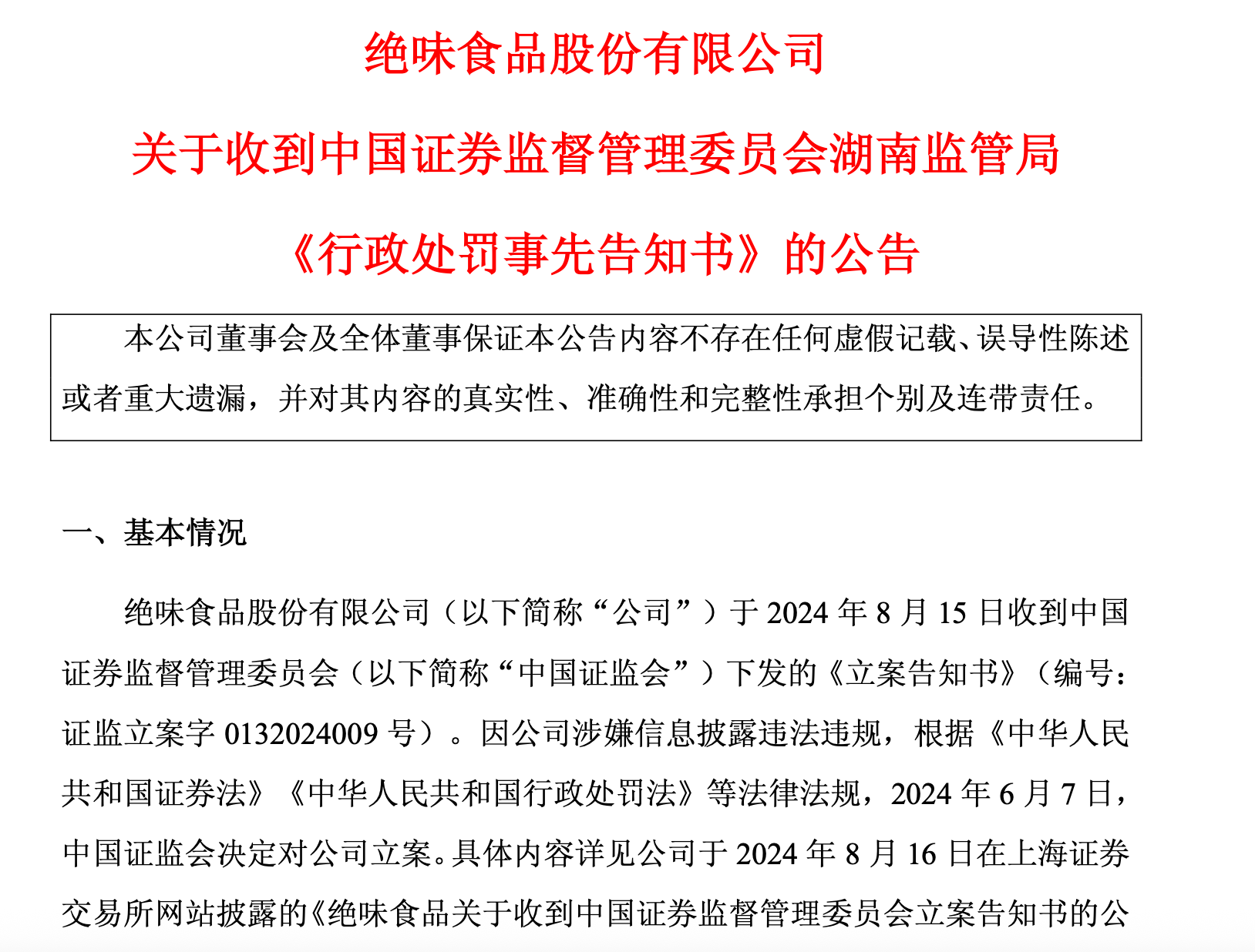 9月19日,绝味食品发布公告称,收到湖南证监局下发的《行政处罚事先告知书》,因2017年至2021年期间年度报告未如实披露营业收入,公司将被处以400万元罚款。