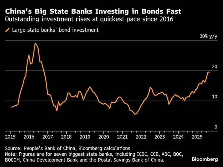 另据彭博的统计,在贷款需求持续疲软和净息差创纪录新低的双重压力下,中国大型国有银行正被迫转向债券投资以维持利润,其债券持有量以2016年以来最快的同比增速(超过20%)扩张,总额已达72万亿元人民币。