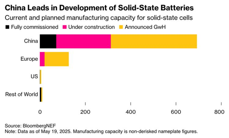固态电池同样是股市的热点。彭博新能源认为,中国在已投产、在建和已宣布的固态电池等方面,均大幅领先欧美同行。