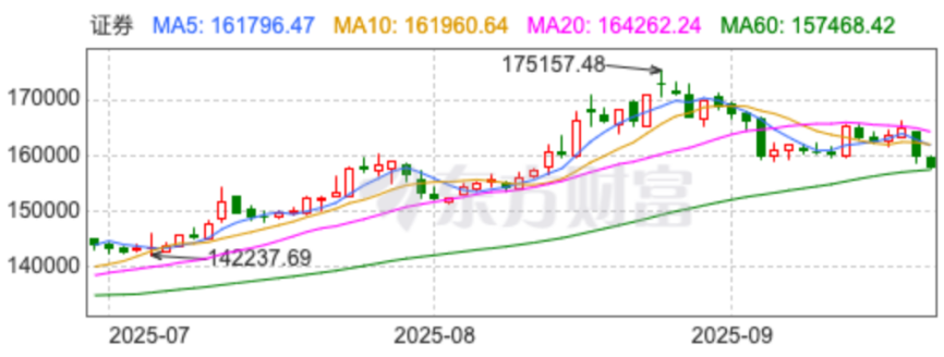 主要金融股中,券商比较坚挺,为指数稳定做出了贡献。直到9月19日,券商板块还在60日线以上,且调整幅度也不大。