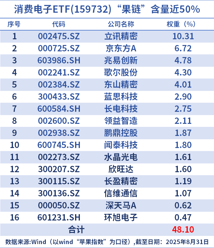 所以整体来看,对于喜欢稳健投资的投资者来说,通过布局消费电子相关的头部ETF来把握这一波行情是一个相对较合适的选择。比如消费电子ETF(159732),该ETF目前国内规模最大的消费主题ETF(最新规模39.44亿元),并且独家跟踪国证消费电子指数,权重股以苹果概念股(48%)+半导体(26%)双管齐下,覆盖了立讯精密(10.31%)、京东方A(6.72%)、兆易创新(4.78%)、歌尔股份(4.3%)、蓝思科技(2.9%)等核心标的,“果链含量”高达48.1%,在消费电子主题指数中位居第一。