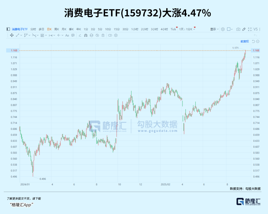 苹果概念股集体拉升,消费电子板块整体表现相当强劲,“果链含量近50%”的消费电子ETF(159732)大涨4.47%。