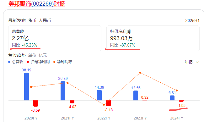 看起来很忙,但效果不尽如人意。2024年,美邦全年营收6.81亿元,同比大幅下降49.79%;归母净利润为-1.95亿元,同比暴跌715.45%。进入2025年,业绩仍未见好转,不久前披露的上半年财报显示,公司营收2.27亿元,同比下跌45.23%;归母净利润993.03万元,同比缩水87.07%。