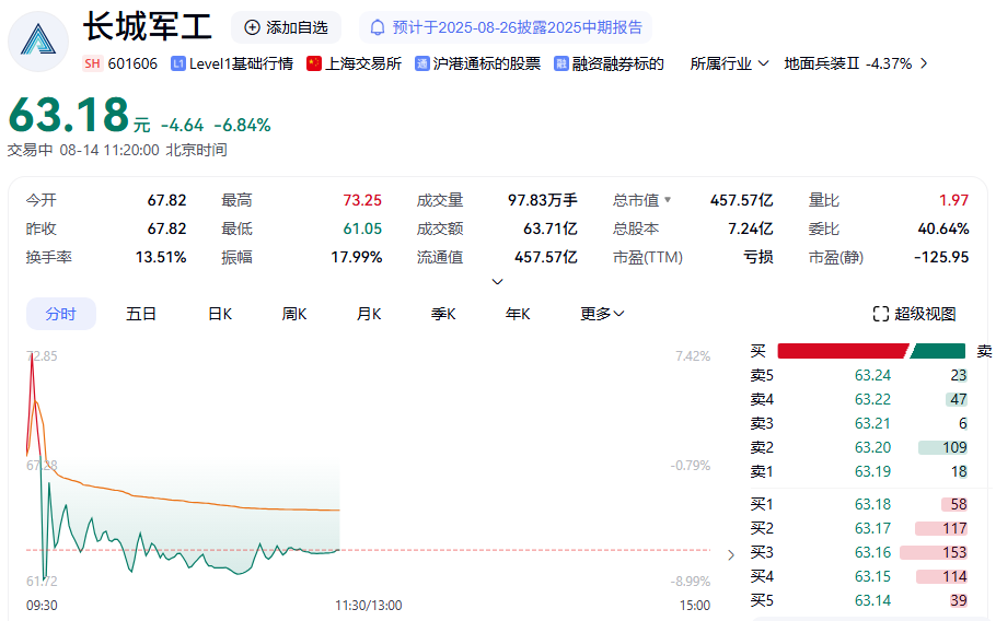 长城军工开盘后一度冲高,续创历史新高,随后大幅跳水,一度触及跌停。截至发稿,该股跌近7%,成交超60亿元。值得注意的是,至8月13日收盘,该股年内已累计大涨近4.8倍。