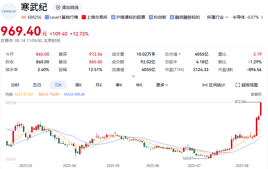 半导体板块走势强劲,截至发稿,龙图光罩一度20%涨停;寒武纪盘中大涨超12%,股价逼近千元大关,市值突破4000亿元。