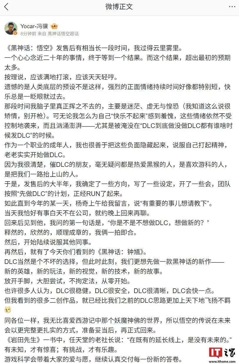 IT之家注意到,游戏科学创始人、CEO,《黑神话:悟空》制作人冯骥尚未休息,在凌晨发布长文,解释了为何选择制作一款新作。其微博原文如下: