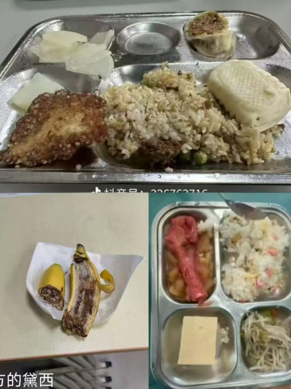 直到在网上看见其他学校家长晒出的餐食照片——没有光泽的米饭、表皮大面积发黑的香蕉,我才意识到不对劲。