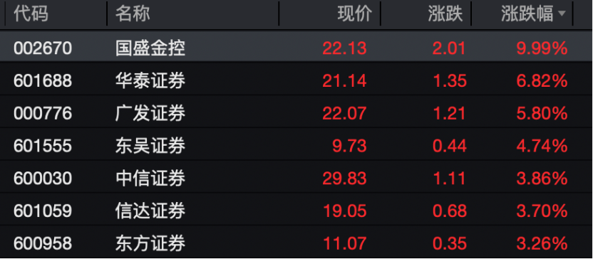 非银金融板块涨幅也超过2%,其中多只券商股盘中大幅拉升。国盛金控涨停,华泰证券、东吴证券、信达证券、广发证券、中信证券等盘中纷纷冲高。