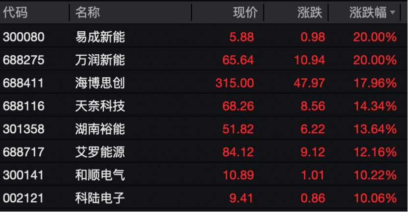 行业板块和赛道方面,若按照申万一级行业划分,电力设备板块领涨,板块盘中涨幅超过3%。其中易成新能、万润新能“20cm”涨停,科陆电子、吉鑫科技、湘潭电化、石大胜华、天际股份等多股涨停,天赐材料盘中一度涨停,另有多股盘中涨幅超过10%。