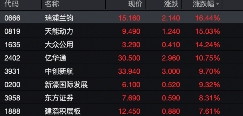 港股通标的中,亿华通、天能动力等多股盘中涨幅超过10%。