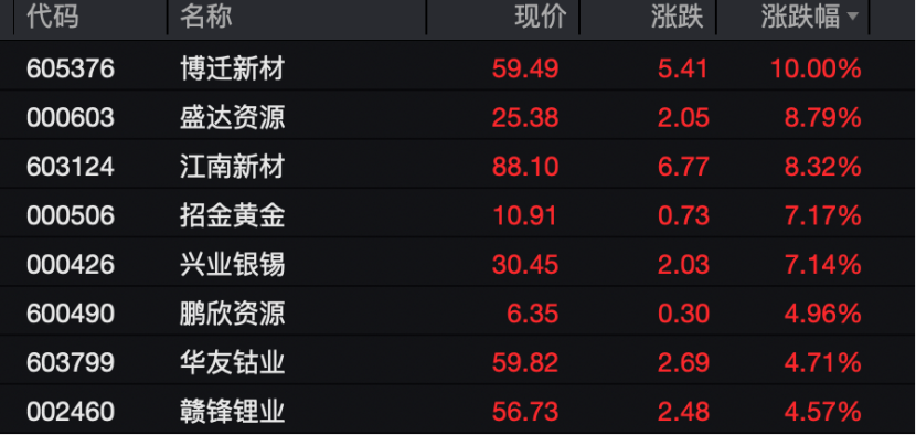 有色金属板块涨幅居前,盘中涨幅接近3%,博迁新材涨停,盛达资源、招金黄金、兴业银锡、江南新材等涨超7%,华友钴业、赣锋锂业等跟涨。