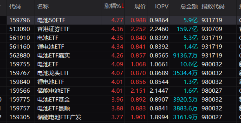 概念板块方面,钠电池、固态电池、锂矿等概念涨幅居前。值得注意的是,多只电池ETF也大涨,不少相关ETF盘中涨幅一度超过5%。