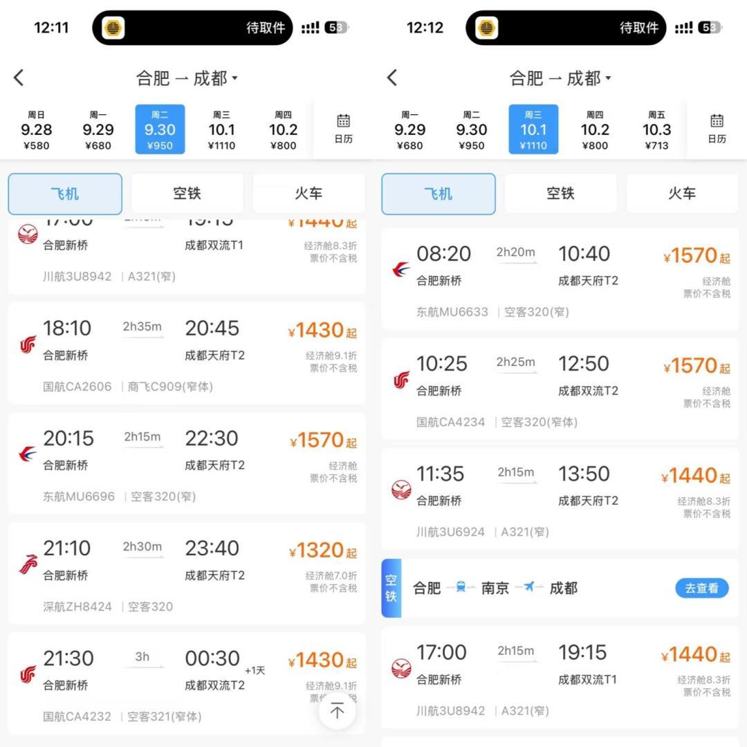 从M小姐提供的出发行程来看, 9.30日和10.1日,合肥到成都的机票价格,一点进去基本都在1400-1500以上。提前一两天有相对便宜的价格,但M小姐请不了假,只能做好取消行程的准备。