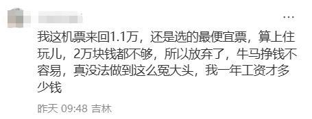 同样被今年机票价格吓退的,还有一个吉林的网友,他评论:“我这机票来回1.1万,算上住玩,2万块钱都不够用,所以放弃了,挣钱不容易,真没办法做到这么冤大头……”