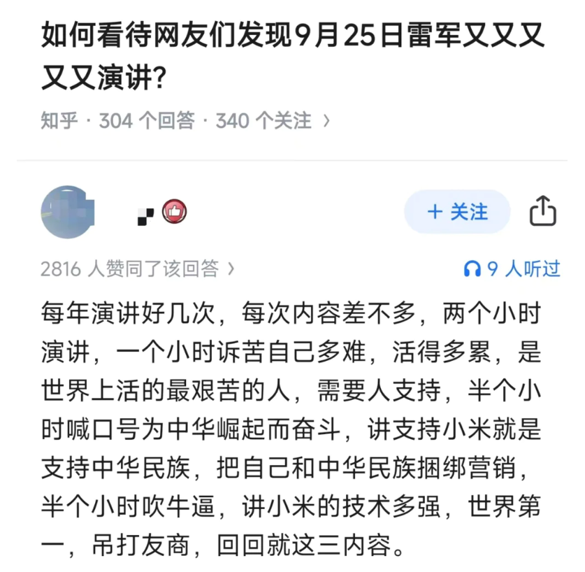 雷军本次演讲中,延续了“焦虑-反思-逆袭”的模块化叙事套路,像极了一碗反复加热的“老鸡汤”。这种“雷式鸡汤”,已让很多人产生审美疲劳。