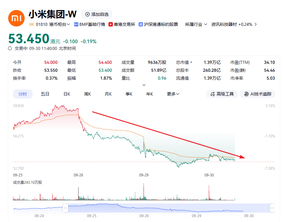接连两个交易日的暴跌,让小米股价从59.45元,一路跌至53.55元,一共跌去了5.9元。